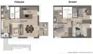 Földszinten előszoba, nappali-étkező, konyha, fürdőszoba, kamra; Tetőtérben 3 db hálószoba, fürdőszoba, gardrób, közlekedő helyiség. Minden lakás kertkapcsolatos és egy 6 nm-es terasz is tartozik hozzá, valamint udvari beálló egy autó részére.